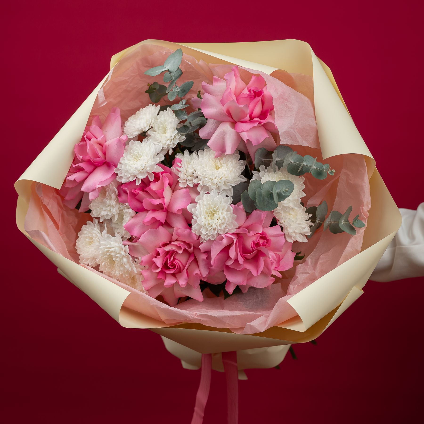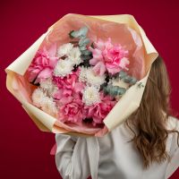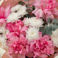 Состав: кустовая хризантема Алтай - 3 шт французская роза розовая - 5 шт упаковка - 1 шт